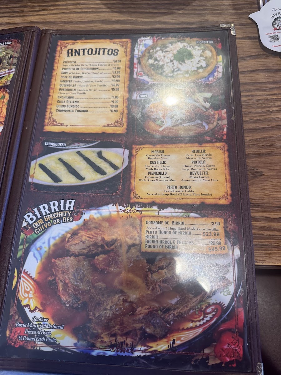 - Main Dishes and Specialties: The menu highlights include dishes such as birria quesadillas, chilaquiles verdes, sopes, tacos de papa, California burrito, barbacoa plates, enchiladas with green chili chicken, chiles rellenos, camarones al mojo de ajo (shrimp in garlic sauce), and panela or carnitas plates.